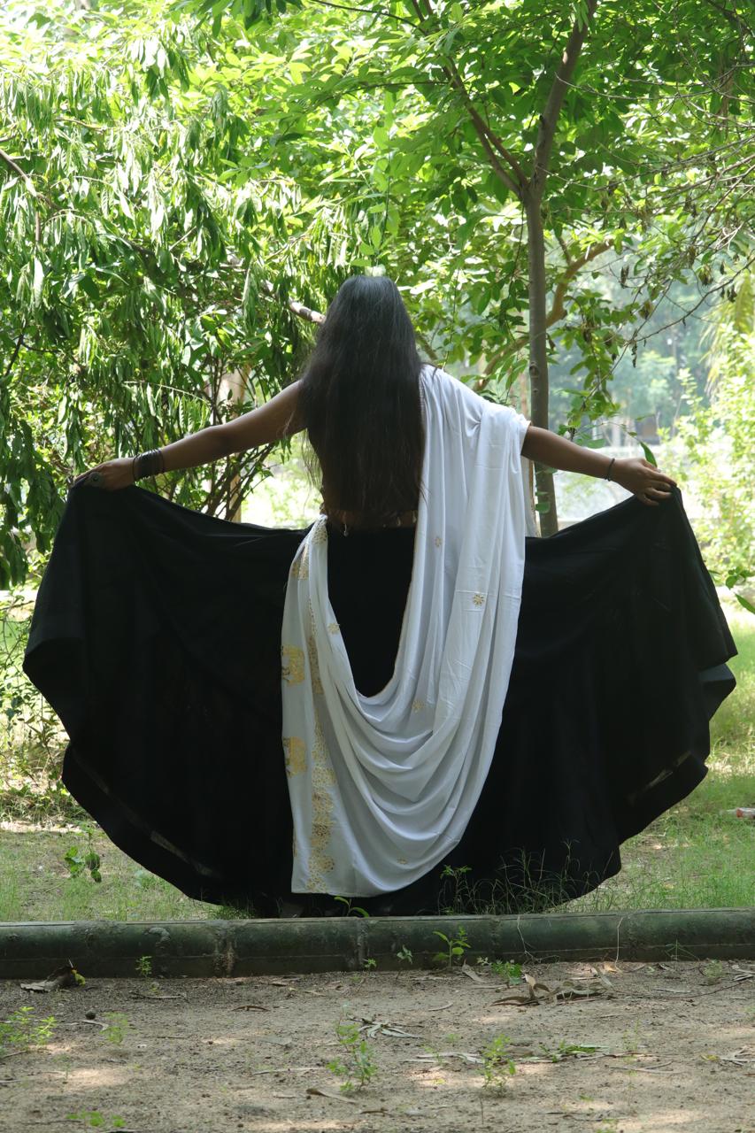 Because it blends timeless black elegance with traditional white & gold detailing, making it suitable for all grand occasions. Be it Navratri, weddings, festive pujas, or cultural gatherings, this set ensures you radiate class, confidence, and royal charm wherever you go.